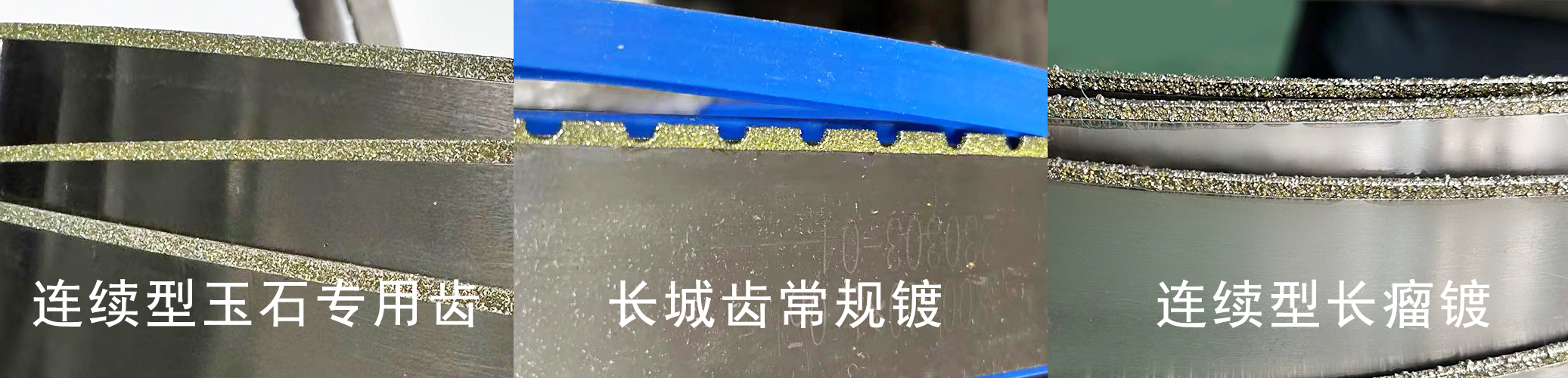 金剛砂帶鋸條常用齒型有:長城齒、長城齒長瘤鍍、間斷齒、連續齒、連續齒長瘤鍍、連續半圓齒、連續型玉石專用齒等。