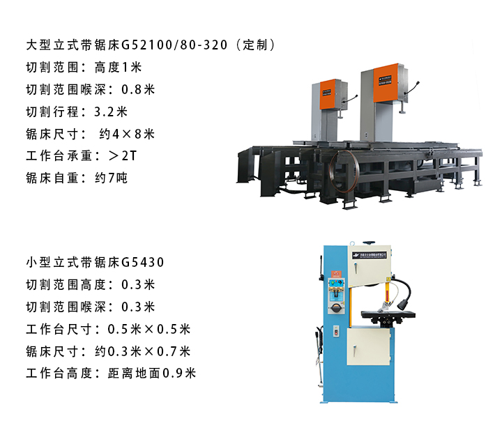 立式帶鋸床可鋸切各種金屬、非金屬工件,例如金屬管材、棒料、方料、鋼胚、不銹鋼、碳鋼、鋁材、石墨、橡膠、皮革甚至風干肉等無數種材料,鋸床能完成各種直線、波線、角度、花樣切割。大型立式帶鋸床的承重大、切割范圍大、占地面積大;,小型立式帶鋸床占地小、便移動、切割范圍小,兩種立式帶鋸床的區別如圖下所示: