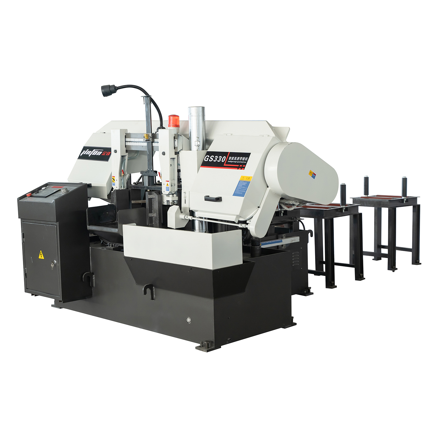 金鋒鋸業(yè)生產的GS330為臥式結構、PLC控制、智能全自動數(shù)控系統(tǒng)、彩色觸摸屏操縱,GS330智能數(shù)控帶鋸床的多模式智能人機界面取代了傳統(tǒng)按鍵,可自由調節(jié)手動與自動雙功能選擇、自由調整鋸切參數(shù)、自由選配任意長度料架,GS330智能數(shù)控帶鋸床采用光柵尺控制送料,可增加激光切割線指示器,鋸床的定位精度高、切割精度高、切割效率高,自動批量切割效率是手動的4倍以上。