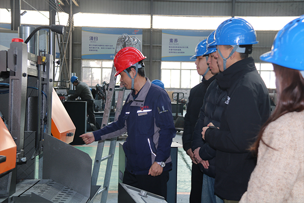 郭總首先從帶鋸床的不同類型、結構原理以及不同類型帶鋸床的性能特點、重要技術參數入手,用多年的工作經驗和通俗易懂的語言進行了詳細解說。為了使新員工更直觀地理解帶鋸床工作原理,郭總還讓相關技術人員啟動機器,親自上手實操,并對帶鋸床運行的相關步驟進行了重點講解和示范。