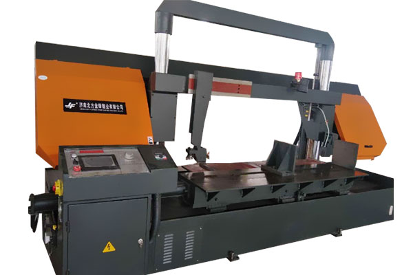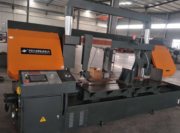 機床由床身、工作臺、立柱、鋸架、夾緊裝置、送料裝置、帶鋸條漲緊裝置、主傳動系統、液壓系統、電器系統、冷卻系統、等部分組成。