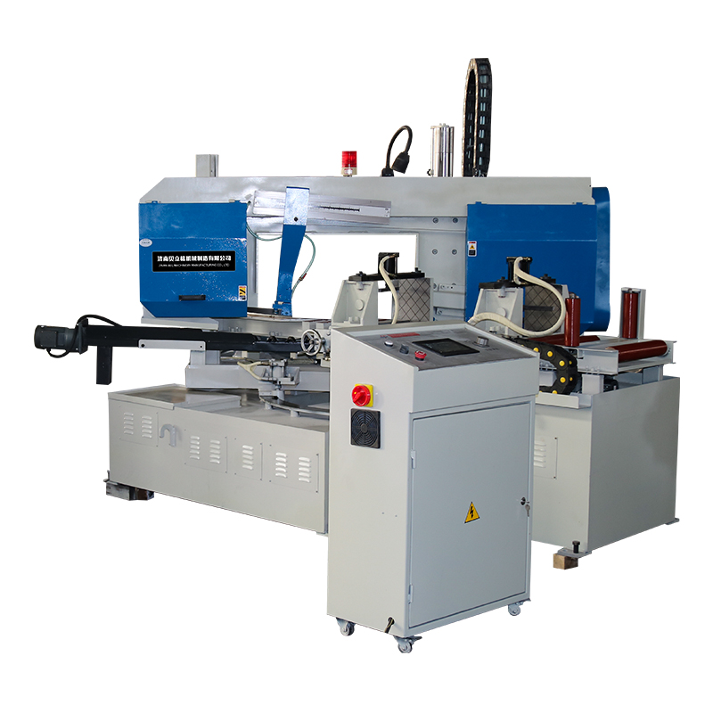 雙立柱結構,可在90°至-45°之間任意角度鋸切,角度旋轉采用伺服電機驅動,運轉靈活、定位精度高。